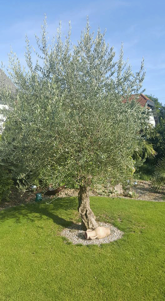 Wir haben unseren ersten Olivenbaum aus Spanien am 10. Februar 2011 im Garten augepflanzt. Im Juni 2016 gesellte sich dann noch ein zweites Exemplar aus der Toskana hinzu. In unseren Gärten ist ein Olivenbaum ganz gut zu kultivieren, da er durchaus bis zu -10 °C an Frost vertragen kann. Ausgepflanzt wachsen sie natürlich um einiges besser als im Topf. Für die Überwinterung empfiehlt sich aber ein regelmäßiger Rückschnitt, damit man ihn allenfalls mit einem Winterschutz noch gut einpacken kann.